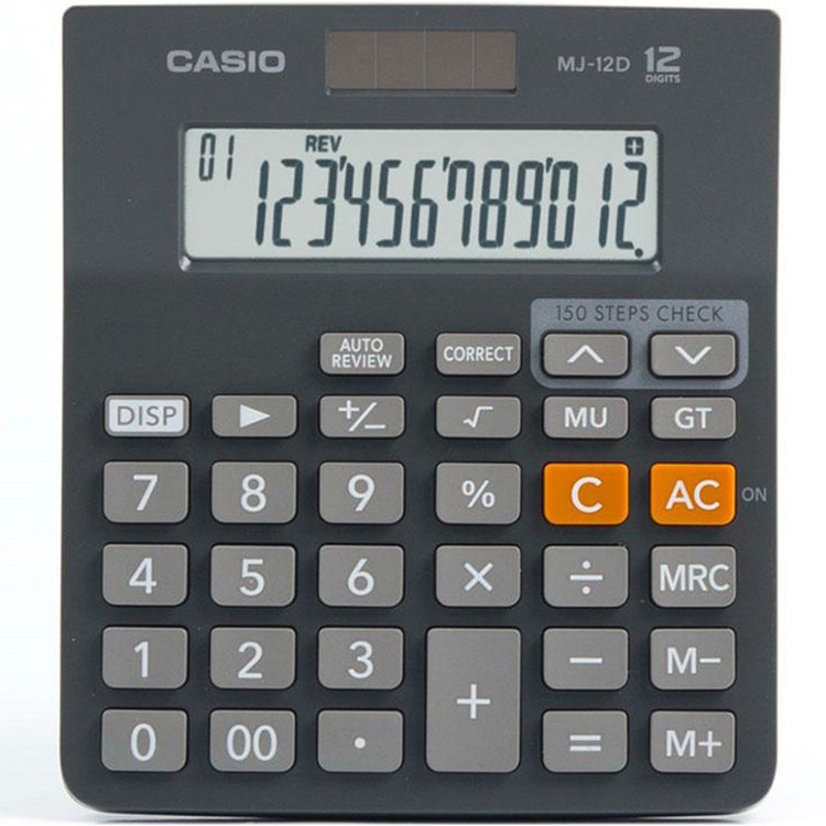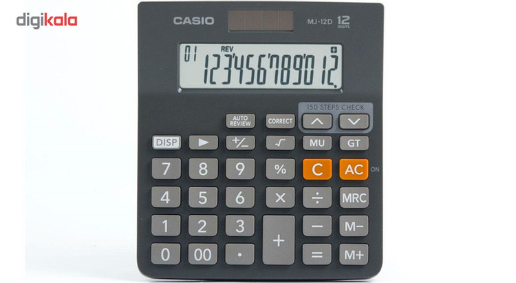 ماشینحساب رومیزی «MJ-12D» ساخت شرکت «کاسیو» یکی از مدلهای جمعوجور این شرکت است که برای استفاده در فروشگاههای کوچک طراحی شده است. این ماشینحساب قادر است محاسبات انجامشده را تا 150 مرحله موردبررسی دوباره قرار دهد و درصورت وجود اشتباه در یکی از مراحل آن را تصحیح کرده و نتیجهی محاسبه را دوباره انجام دهد؛ همچنین با استفادهی دکمهی DISP میتوانید نحوهی نمایش اعداد را در حالتهای مختلف جداسازی ارقام تغییر دهید. این ماشینحساب هم مانند مدلهای دیگر برای تامین برق مصرفی خود علاوهبر باتری از سیستم پنل خورشیدی استفاده میکند. این سیستم قادر است تا نور خورشید را در محیطهای روشن جذب کرده و به برق تبدیل کند تا کاربر دیگر نیازی به استفاده از باتری نداشته باشد. از دیگر قابلیتهای این ماشینحساب رومیزی و ساده میتوان به محاسبهی درصد و جذر اشاره کرد. صفحهنمایش بزرگ دستگاه قادر است تا دوازده عدد را نمایش دهد و ازاینرو، میتوان گفت که این مدل برای انجام محاسبات با ارقام بهنسبت طولانی مناسب است.