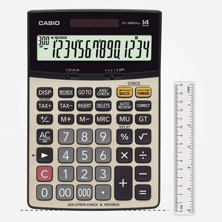 محصولی که در این قسمت مشاهده میکنید یکی از مدلهای رومیزی شرکت کاسیو است. شرکت کاسیو سابقهی بسیار درخشانی درزمینهی تولید ماشینحساب داشته و در میان کاربران بسیار محبوب است. این مدل رومیزی قادر است تا 12 عدد را با اندازهی درشت نمایش دهد. این ماشینحساب همانند دیگر مدلهای Plus میتواند محاسبات انجام شده را تا 300 مرحله کنترل نماید. میتوانید کنترل محاسبات را بهصورت دستی انجام داده و یا تنها یک دکمه را فشار دهید. برای افزایش مقاومت دستگاه در برابر استفادهی مداوم و طولانیمدت روکش این ماشینحساب بهصورت فلزی طراحی شده و همچنین دکمههای دستگاه از پلاستیک باکیفیت هستند. برای جدا نمودن اعداد دستگاه 4 حالت مختلف را فراهم کرده است که با استفاده از دکمهی تعبیه شده در بالای بدنه قابل تنظیم است. از امکانات محاسباتی این مدل میتوان به محاسبهی مالیات، درصد، سود و هزینه اشاره نمود. برق مصرفی این دستگاه از دو منبع باتری و پنل خورشیدی تأمین میشود.