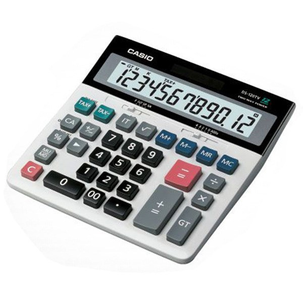 ماشینحساب «DS-120TV» ساخت شرکت کاسیو از مدلهای رومیزی است که نسبت به مدلهای دیگر اندازه و دکمههای بزرگتری دارد که درنتیجهی آن کار کردن با آن آسانتر از قبل میشود. صفحهنمایش بزرگ آن با قابلیت نمایش 2 عدد نسبت به مدلهای 8 عددی ارجحیت داشته و عددهای بزرگ آن بهآسانی قابلخواندن هستند. برق مصرفی دستگاه از دو منبع باتری و پنل خورشیدی تأمین میشود و در طی روز نیازی به باتری دستگاه ندارید و پنل خورشیدی تعبیهشده در این مدل نور خورشید را به جریان برق تبدیل میکند و تنها طی شب و در محیطهای کمنور مجبور به استفاده از باتری هستید. قابلیت دیگر «Key-Rollover» است. درنتیجهی این قابلیت ماشینحساب در موارد وارد نمودن سریع دادهها و اعداد بهآسانی فشرده شدن هر دکمه را آنالیز کرده و درنتیجه اشتباهی رخ نمیدهد. همچنین این ماشینحساب قادر است تا بهصورت اتوماتیک قیمت بهعلاوهی مالیات، قیمت بدون مالیات، تخفیف، قیمت فروش، میزان مالیات، میزان تخفیف و حاشیهی سود را محاسبه نماید. از دیگر ویژگیهای این ماشینحساب میتوان به محاسبهی درصد و Markup اشاره نمود. با قابلیت Markup اختلاف میان قیمت خرید و قیمت فروش و درنتیجه هزینهها و سود محاسبه میشود. علامتهای (+ - ÷ ×) عملیات در حال انجام را بر روی صفحهنمایش نشان میدهد.