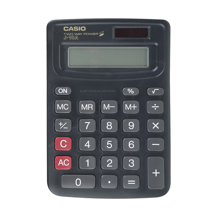 + موارد بیشترماشین حساب از آن دسته وسایلی است که بهدلیل افزایش حجم محاسبات در زندگی روزمره بیش از پیش به آن نیاز میشود هر چند گوشیهای موبایل و کامپیوترها امروزه دارای ماشین حسابهای پیشرفته هستند اما داشتن یک ماشین حساب جداگانه برای انجام برخی محاسبات در کلاسهای درس و امتحانات بسیار کاربردی است. ماشین حساب مدل J-10ABK محصولی از «کاسیو» (Casio) است که به صورت ساده و در ابعاد کوچک طراحی و تولید شده است، برای همین به راحتی میتوان آن در کیف خود قرار داده و آن را حمل کرد. صفحه نمایش این محصول LCD تک خطی است؛ این به آن معناست که عبارات محاسباتی نمیتوانند به شکل نگارشی کتاب درسی وارد شوند. صفحه مایش این ماشین حساب جای کافی برای نمایش 10 کاراکتر در یک خط را دارد. انرژی مورد نیاز این ماشین حساب از طریق باتری و پنل خورشیدی تامین می شود.