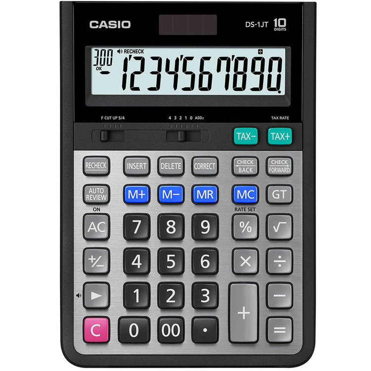 ماشینحساب «DJ-1JT» محصولی از شرکت «کاسیو» (Casio) است. این ماشینحساب صفحهنمایش یکخطی 10 رقمی دارد. بهمنظور سهولت در استفاده، صفحهنمایش این ماشینحساب بزرگ طراحیشده است. تناسب بین ابعاد کلیدها و ابعاد کلی ماشینحساب بهخوبی رعایت شده است و یک انگشت بهراحتی بر روی کلید قرار میگیرد؛ به همین دلیل احتمال بروز خطا در محاسبات سریع کاهشیافته است. این محصول دارای کلیدهای حافظه، GT، درصد، TAX+ و TAX- و دو صفره است. تأمینکننده انرژی این ماشینحساب شرکت کاسیو، باتری و پنل خورشیدی است و با مجهز شدن به حالت خاموش خودکار، هنگامیکه از ماشینحساب DJ-1JT استفادهای نمیکنید، خاموش میشود. این ماشینحساب علاوه بر بادوام بودن، از کیفیت ساخت بالایی برخوردار است؛ بهطوریکه هنگام فشردن دکمهها به این مسئله پی خواهید برد. این دستگاه ماشین حساب به ویژگی Key Rollover مجهز شده است تا در انجام سریع محاسبات، تمامی ارقام وارد شده و محاسبه شوند.