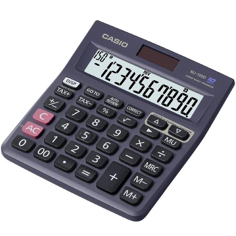 ماشینحساب «MJ-100D» ماشینحسابی رومیزی است که میتوانید از آن برای انجام محاسبات روزمرهی خود و یا در فروشگاه از آن استفاده کنید. این ماشینحساب قادر است محاسبات را تا 150 مرحله چک نماید و اعداد را در 4 فرمت مختلف نمایش میدهد. صفحهنمایش بهکاررفته در این ماشینحساب بسیار بزرگ بوده و خواندن اعداد در آن بسیار آسان است. پنل خورشیدی بهکاررفته در این محصول بسیار کاربردی است زیرا در طول روز و در محلهای پرنور بدون نیاز به باتری میتوانید از دستگاه استفاده کنید. در هنگام شب و در محلهای کمنور باتری دستگاه برق موردنیاز را تأمین میکند. تمامی عملیات انجامشده در حافظهی دستگاه ذخیره میشوند و میتوانید مطمئن باشید حتی در صورت واردکردن سریع اعداد بهراحتی میتوانید ورودیهای خود را چک کنید و درنتیجه هیچ موردی از قلم نمیماند. دکمههای پلاستیکی ماشینحساب بسیار راحت بوده و وارد نمودن اعداد و انجام محاسبات بهراحتی انجام میشود. درواقع میتوان گفت کاسیو در طراحی ماشینحسابهای خود نهایت تلاش خود را کرده است تا دستگاههایی ارائه دهد که کاربری بسیار آسانی داشتهباشند. این موضوع را میتوانید در اندازهی بزرگ صفحهنمایش و کلیدها مشاهده کنید. طراحی کلیدها بهگونهای است که تکتک کلیدها بزرگ بوده و از همدیگر فاصله دارند. این موضوع فشرده شدن اشتباهی کلیدها را در سرعتهای بالای وارد نمودن اعداد به حداقل میرساند. یکی دیگر از ویژگیهای این ماشینحساب کاربردی و سختجان محاسبهی اتوماتیک قیمت بهاضافهی مالیات، قیمت بدون مالیات، تخفیف، قیمت فروش، میزان مالیات، میزان تخفیف، و میزان حاشیه است.