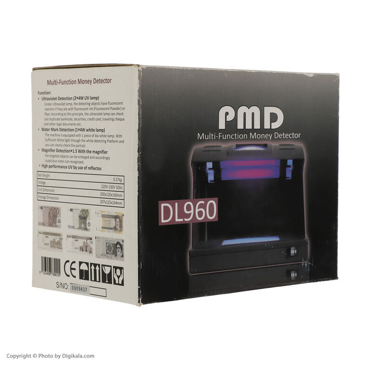 دستگاه تشخیص اسکناس DL960 شرکت PMD جهت تشخیص اصالت انواع اسکناس، چکهای مسافرتی و هرگونه اوراقی که تکنولوژی ماورابنفش (UV) و تصاویر نامرئی (Water Mark) را مورد استفاده قرار میگیرد. برای عملکرد در حالت ماورابنفش، ابتدا دستگاه را در وضعیت II قرار دهید و سپس دو لامپ ماورابنفش قسمت بالایی روشن میشود. حال میتوانید انواع اسکناس، چکهای مسافرتی، چکهای بانکی و کلیه اسنادی که دارای جوهر یا الیاف حساس به UV هستند را با استفاده از این محصول مورد بررسی قرار دهید تا از اصالت آن مطلع شوید. نور سفید یا همان water mark هم میتواند کلی تصاویر نامرئی موجود در متن اسکناس را نمایش دهد.