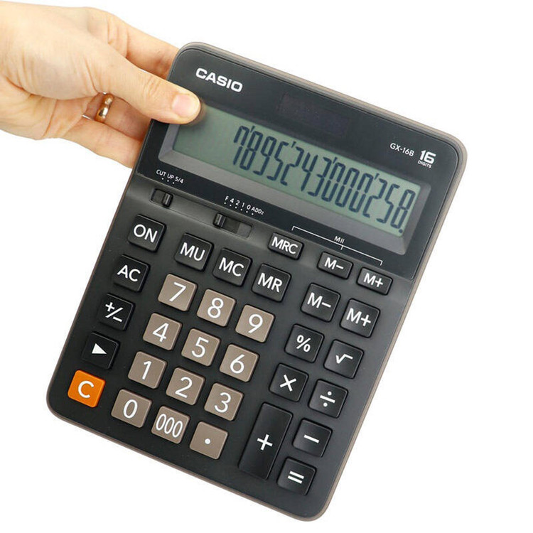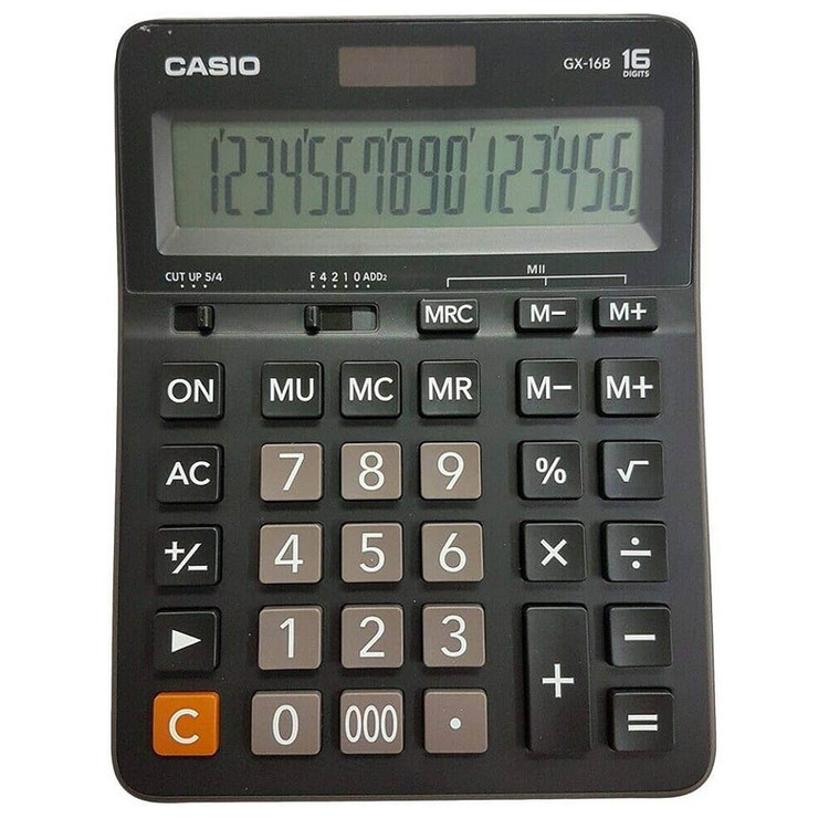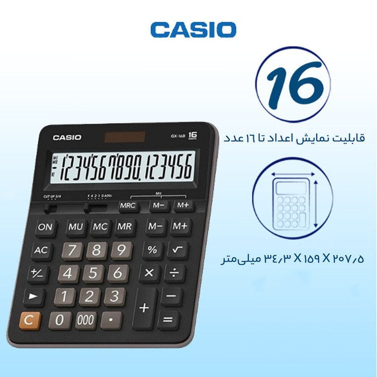قطعا پیداکردن ماشینحسابی با قابلیت نمایش شانزده عدد کار آسانی نیست. ماشینحساب رومیزی «GX-16B» ساخت شرکت «کاسیو» یکی از همین مدلهاست. این ماشینحساب با این قابلیت خود میتواند برای محاسبات با اعداد طولانی مورداستفاده قرار گیرد. این مدل ابعاد بهنسبت بزرگی دارد و بهخوبی میتواند در محیطهای فروشگاهی یا محیطهای اداری برای انجام محاسبات ساده مورداستفاده قرار گیرد. دکمههای این محصول که از جنس پلاستیک ساخته شدهاند بسیار بادوام بوده و در طول زمان کیفیت خود را حفظ میکنند. این ویژگی در تمامی محصولات کاسیو دیده میشود و معمولا محصولات کاسیو عمری طولانی دارند. از دیگر قابلیتهای این ماشینحساب میتوان به محاسبهی درصد و جذر اشاره کرد. ماشینحساب برای تامین برق مصرفی خود علاوهبر باتری از پنل خورشیدی استفاده میکند. بهاین معنا که در شرایطی که نور محیط مناسب است دستگاه نور را جذب کرده و به برق تبدیل میکند و کاربر نیازی به استفاده از باتری ندارد.