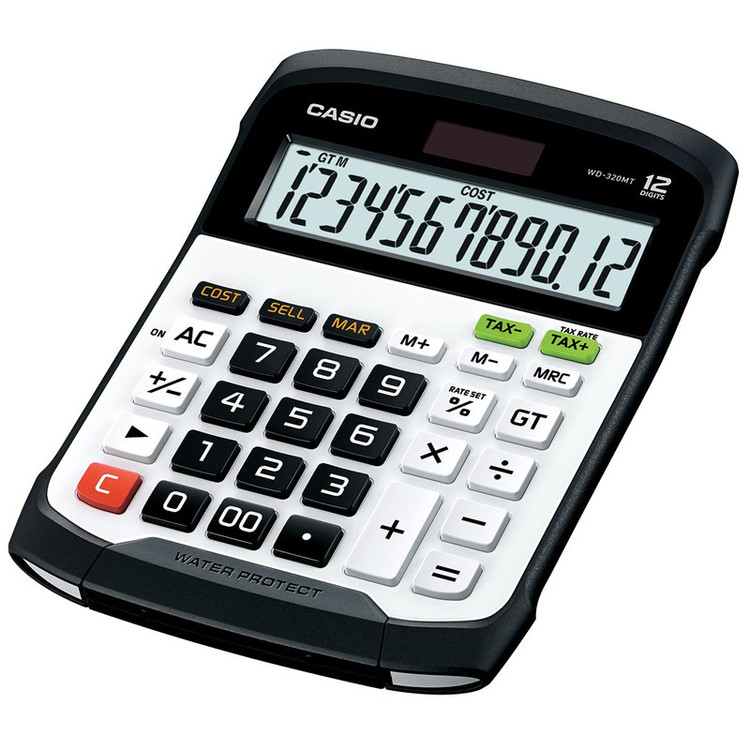 دستگاه «WD-320MT» ساخت شرکت «کاسیو»، ماشینحسابی برای استفاده در محیطها و شرایط خاص مناسب است و در برابر آب و گردوغبار مقاوم ساخته شده است و میتوان حتی در بازارهای روباز مانند میادین میوه و ترهبار از آن استفاده کرد. طراحی نوین این محصول سبب شده که بتوان صفحهکلید آن را جدا کرد و شست. درنتیجه، این محصول برای سالیان دراز تمیز مانده و کیفیت روز اول خود را حفظ میکند. این ماشینحساب باوجود ظاهر فانتزی خود قادر است عملیات محاسباتی مانند محاسبهی قیمت فروش، هزینهی خرید و حاشیهی سود را محاسبه کند. از دیگر قابلیتهای این ماشینحساب میتوان به محاسبهی مالیات اشاره کرد. نیروی مصرفی این ماشینحساب توسط باتری و پنل خورشیدی تامین میشود؛ درنتیجه، در شرایطی که نور محیط کافی باشد پنل خورشیدی نور خورشید را جذب کرده و به برق تبدیل میکند.