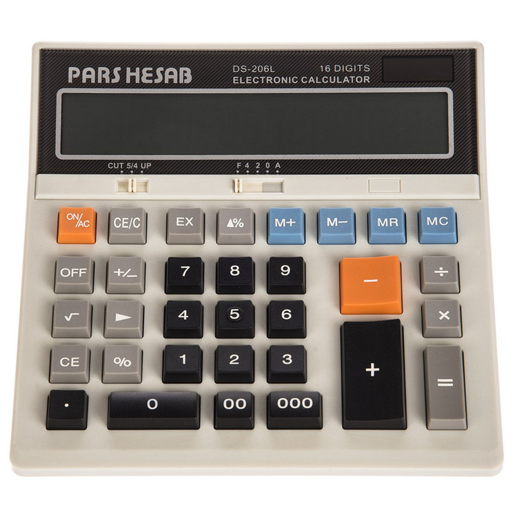 ماشینحساب رومیزی «DS-206L» محصولی از شرکت «پارس حساب» و یک ماشین حساب کاملا ایرانی است. صفحهنمایش این دستگاه ارقام را بزرگ و خوانا نشان میدهد و از زاویه دید خوبی برخوردار است. برای تأمین برق مصرفی این ماشینحساب، دو منبع باتری و پنل خورشیدی در نظر گرفته شدهاند که درنتیجهی آن باتری تنها برای مواقع ضروری مانند تاریکی مورداستفاده قرار میگیرد و در باقی موارد در صورت روشنایی کافی محیط، دستگاه نور محیط را جذب و به نیروی موردنیاز خود تبدیل میکند. ماشینحساب DS-206L دارای دکمه های % ، تک پاکن، دو صفر، سه صفر و حافظه M+ و M- برای افزایش سرعت عمل است. دکمهها با فاصله مناسبی چیده شدهاند و ابعاد آنها طوری است که انگشت بهخوبی بر روی آن قرار میگیرد. درصورتیکه سرعت عمل را در دستور کار دارید، بدون شک چنین طراحی یک مزیت محسوب میشود و در کاهش خطا تاثیر بسزایی دارد. گفتنی است این ماشین حساب از قابلیت تنظیم تعداد ارقام اعشاری نیز بهره میبرد.